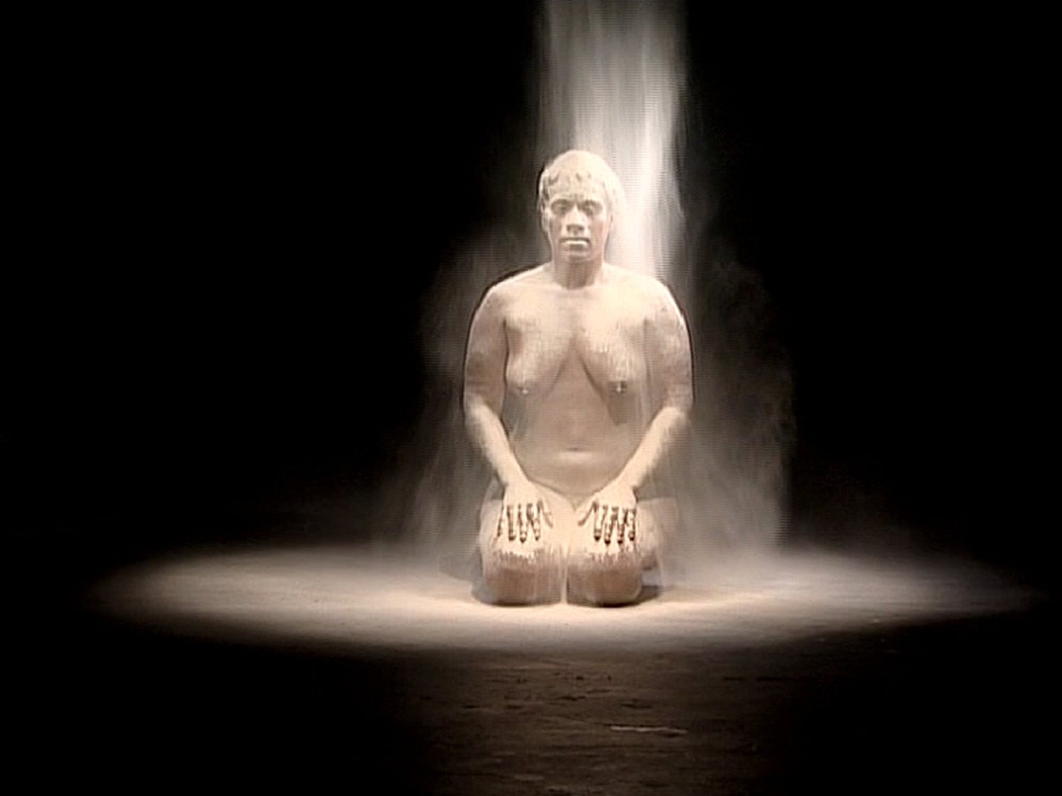 In ihrer Videoarbeit SNOW WHITE greift Berni Searle die perfiden diskriminatorischen Klassifizierungsstrategien unter der Apartheid in Südafrika auf, indem sie ihren eigenen Schwarzen Körper vorführt. Die Künstlerin wird aus zwei unterschiedlichen Perspektiven gefilmt – frontal sowie vertikal von oben. Wasser und weißes Mehl rieseln an ihrem nackten Körper herunter und legen sich als dünne, blasse Schicht über ihre Haut – ein ästhetisch-poetisches. körperliches Maskieren an der Schwelle vom äußeren und inneren Sein. Searle beginnt das Mehl zusammen mit dem Wasser zu einem plastischen Teig zu kneten – eine individuelle Suche nach den Möglichkeiten und Potentialen von Identität und Weiblichkeit jenseits von kategorischen, oberflächlichen Zuschreibungen. Ebenso verweist der Titel SNOW WHITE, der an das Märchen Schneewittchen der Gebrüder Grimm anlehnt, auf die Normalität sexistischer, rassistisches Narrative und Darstellungen. Die performative körperliche Praxis dient Searle als Weg sich selbst neu zu erfinden.